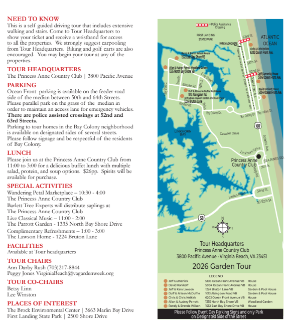 Relaxed elegance defines the oceanfront of Virginia Beach. This tour features the North End and Bay Colony neighborhoods, where visitors will enjoy seven private properties. In the area known as The Gold Coast, three oceanfront homes, each with its distinct architecture, interior design, and breathtaking views of the Atlantic Ocean, will be showcased. Nestled off of 47th Street, visitors will wind through Bay Colony enjoying a one-acre woodland garden, a beautiful home off of Linkhorn Bay, and two backyard retreats each with lush gardens and sparkling pools. Lunch will be available for purchase at the Princess Anne Country Club.